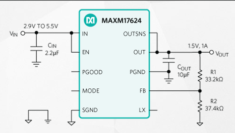 MAXM17623和MAXM17624模塊在穩(wěn)態(tài)工作時采用峰值電流模式控制方法。為降低輸入浪涌電流,器件提供1ms固定軟啟動時間。兩款模塊均可選擇輕載時采用PWM或PFM模式。選擇PWM模式時,MAXM17623工作在固定2MHz開關(guān)頻率,MAXM17624工作在固定4MHz開關(guān)頻率。MAXM17623提供0.8V至1.5V輸出電壓,MAXM17624提供1.5V至3.3V輸出電壓。
